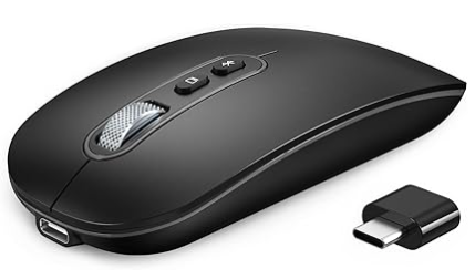 Let’s be honest right away – it’s not a brand-name mouse, and the build quality isn’t even comparable to Logitech’s. But it charges via USB-C. It’s very thin. And it has an integrated dongle (also USB-C!) to work at 2.4 GHz as well as with Bluetooth. So not only does it have what I was looking for, but much more.